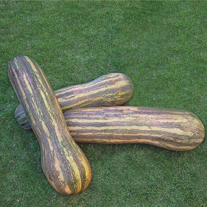 Alongado com pescoço; Casca com textura lisa; Coloração verde claro/creme com estrias verdes; Polpa de textura firme; Dimensões de 0,18 x 1m; Uniformidade